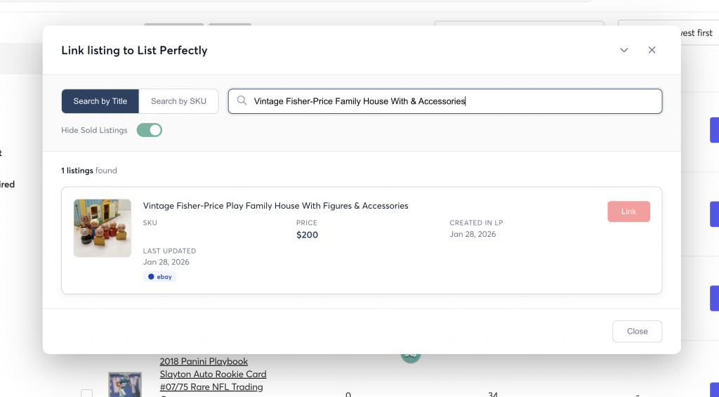 Linking connects a live marketplace listing — on platforms like eBay, Poshmark, Mercari, Etsy, or Depop — to the same item inside your List Perfectly Catalog.