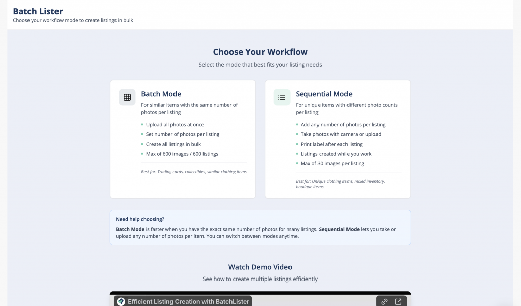 Batch Mode removes repetitive manual steps and keeps listings uniform across similar items.
