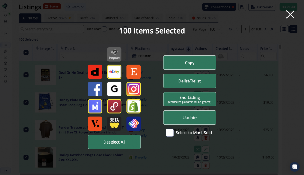 - ✅ Unlimited Bulk Tools: Bulk Import, Bulk Edit, Bulk Crosslisting, Update, Mark Sold, and more