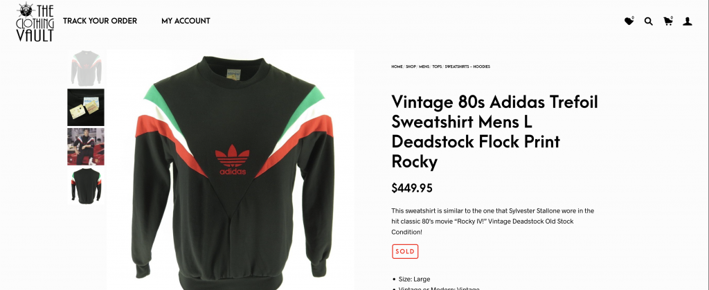 - Vintage 80s Adidas Trefoil Sweatshirt (Men’s L, Deadstock Flock Print, Rocky)